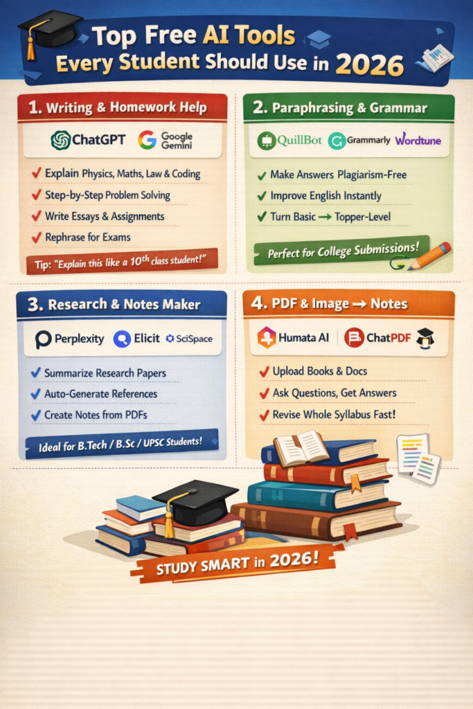 | Notion AI-2-4-5 | Organizing notes, managing tasks, and summarizing content within the Notion workspace. | AI features are a paid add-on, but students often get free or discounted access to the premium Notion plan. -5-6 | |